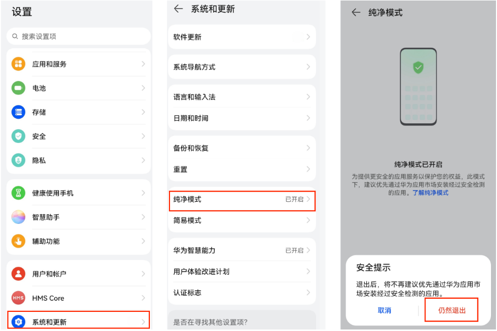 【关闭纯净模式】:点击设置 > 系统和更新 > 纯净模式 ,点击退出,关闭纯净模式。