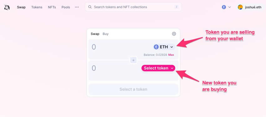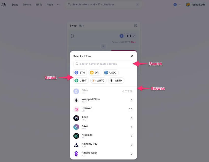 2.选择“选择令牌”图标并浏览列表以查找令牌。还可以按代币名称或代币合约地址进行搜索。