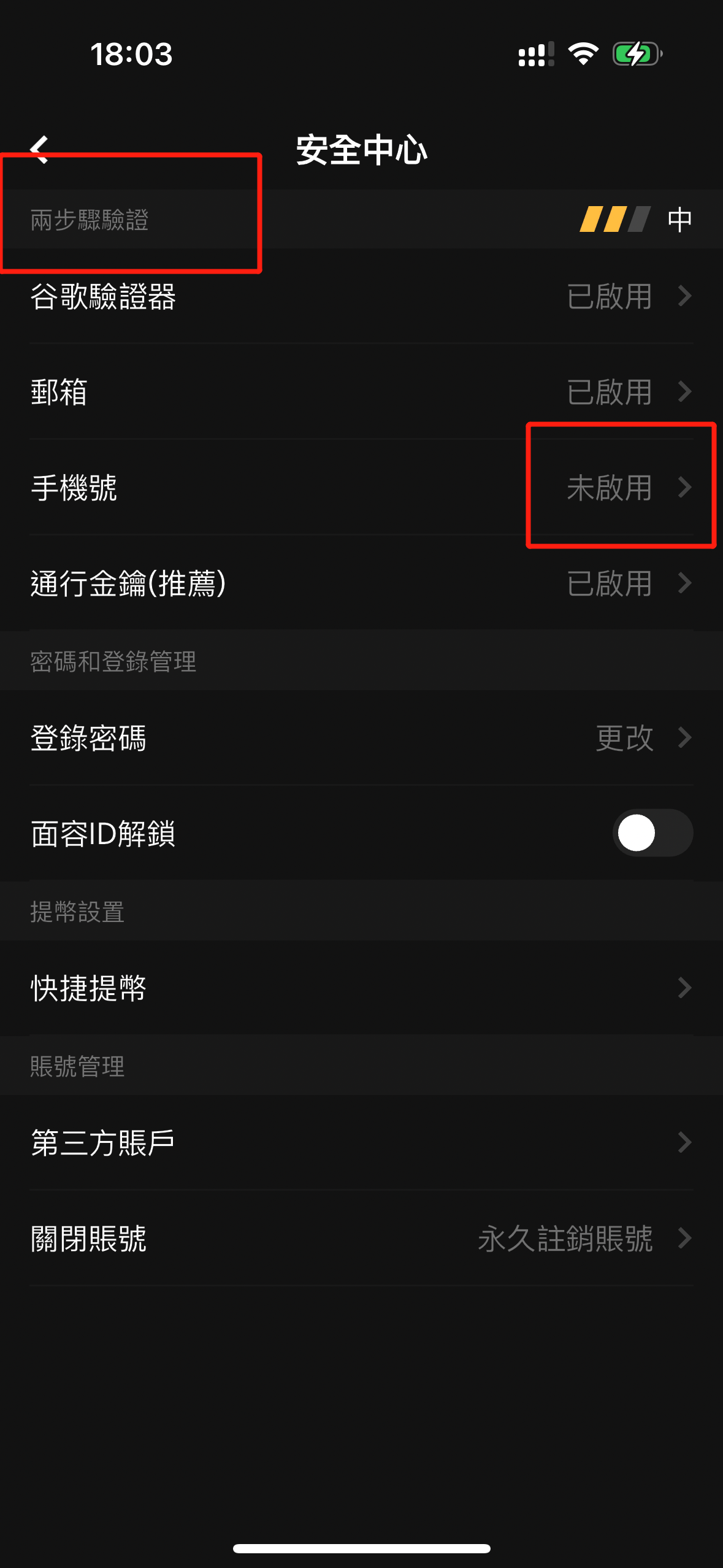 在已启用的验证方式(如邮箱、谷歌验证器、通行密钥等)右侧会显示“已启用”状态,点击进入后可看到“更改”选项。