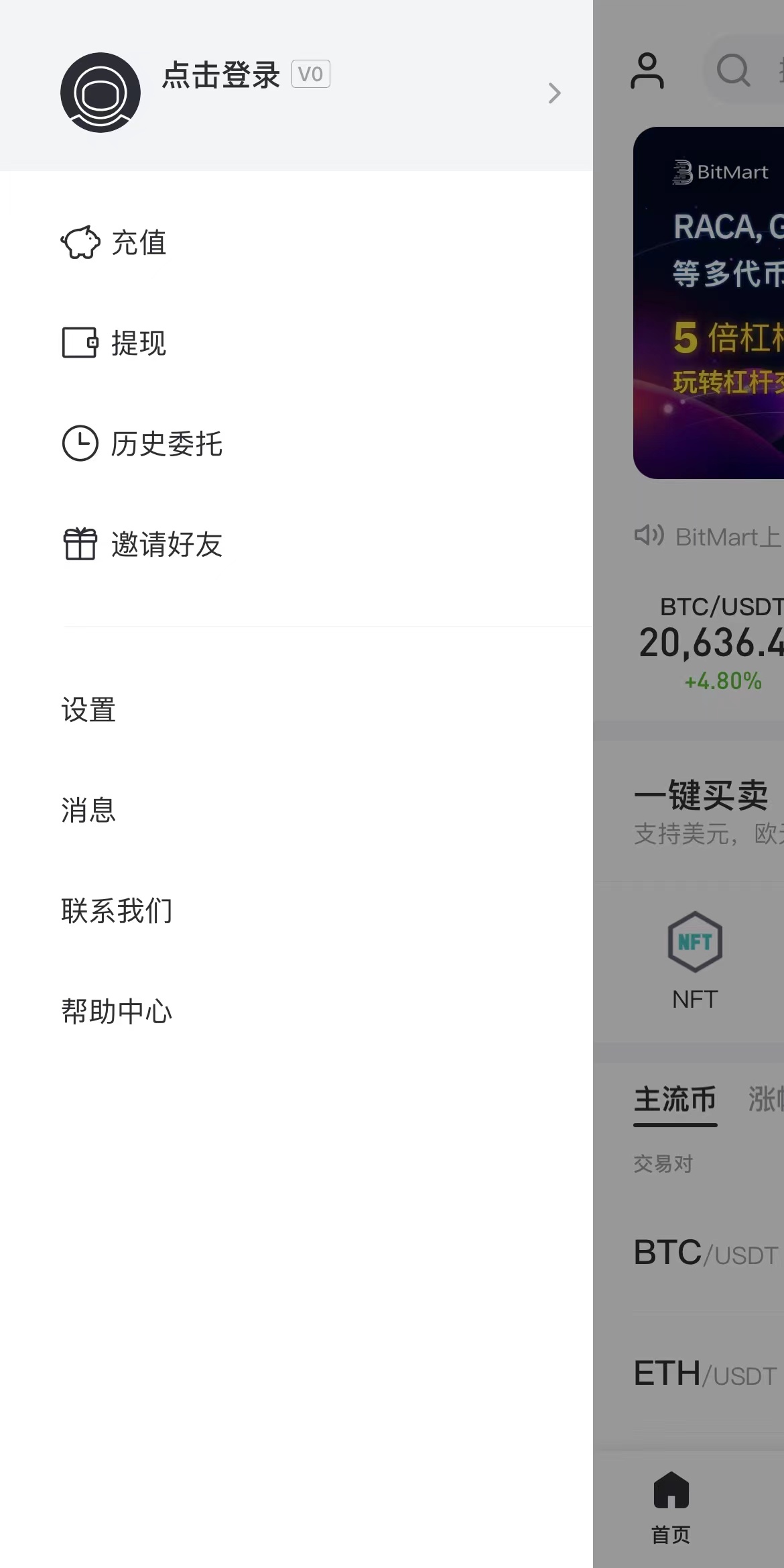 打开BitMart App,点击【首页】右上角标识,进入【个人设置页】,点击【登录】。