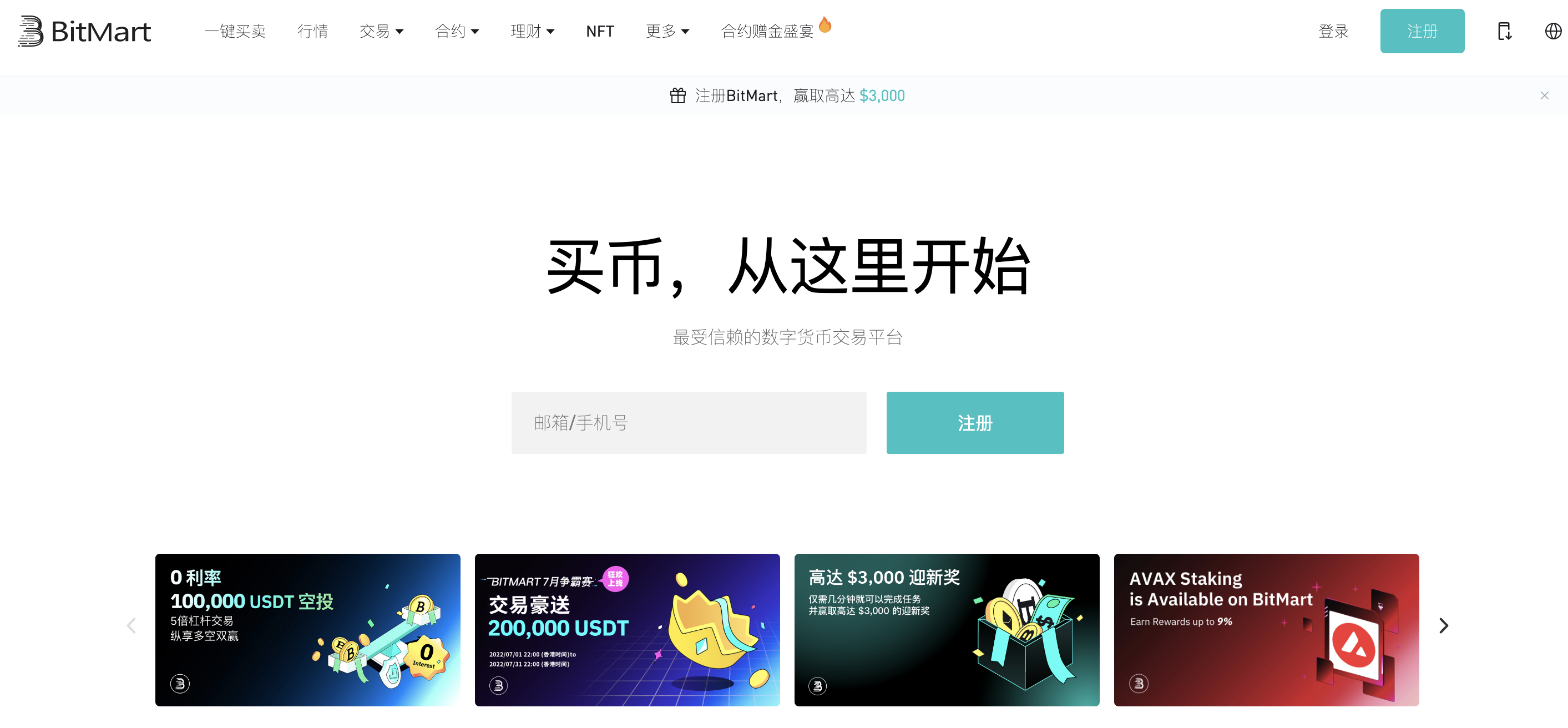 1、进入BitMart官网(https://www.bitmart.com/cn),点击右上角【注册】。