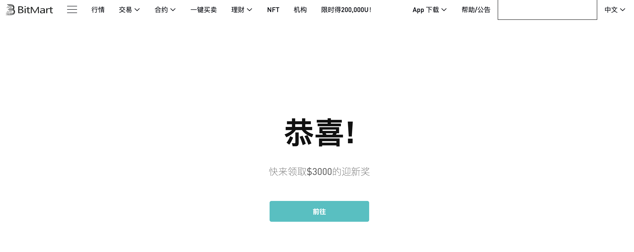 6、恭喜! 您已成功创建BitMart账户。目前迎新活动火热进行中,注册、充值、交易即可获得最高3000美元的新手奖励,点击【前往】,即刻参与。
