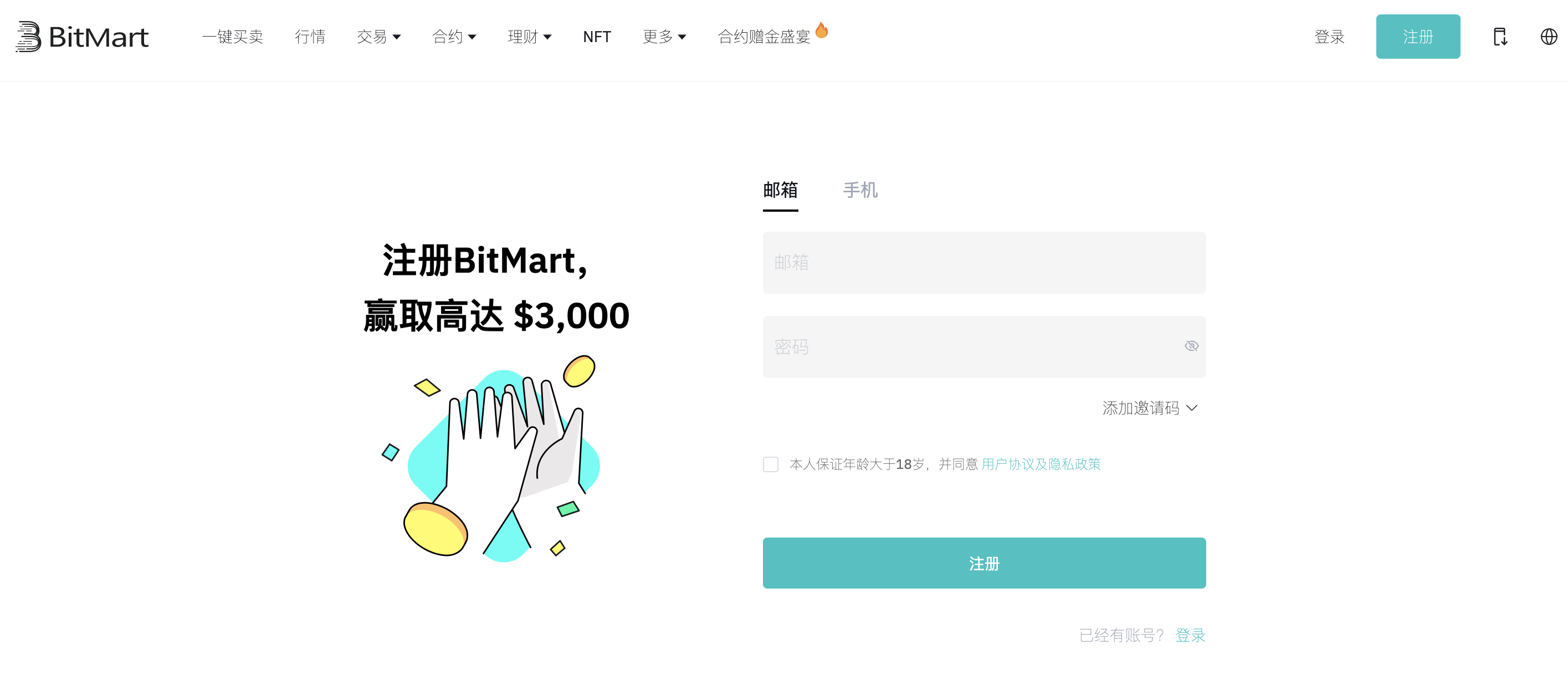 您可以在BitMart App上使用您的电子邮箱、手机号注册帐户。
