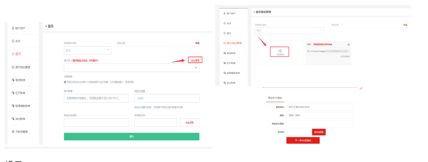 3、以比特币(BTC)为例,您需要选择“提币地址”(首次提到新地址务必要添加并认证接收地址,点击“地址管理”→“添加地址”,通过输入接收地址、昵称、资金安全密码,获取并输入动态验证码信息,点击“下一步认证地址”)。
