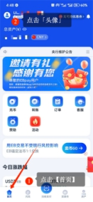 1、登陆EBpay App后点击【首页】,点击左上角「头像」;