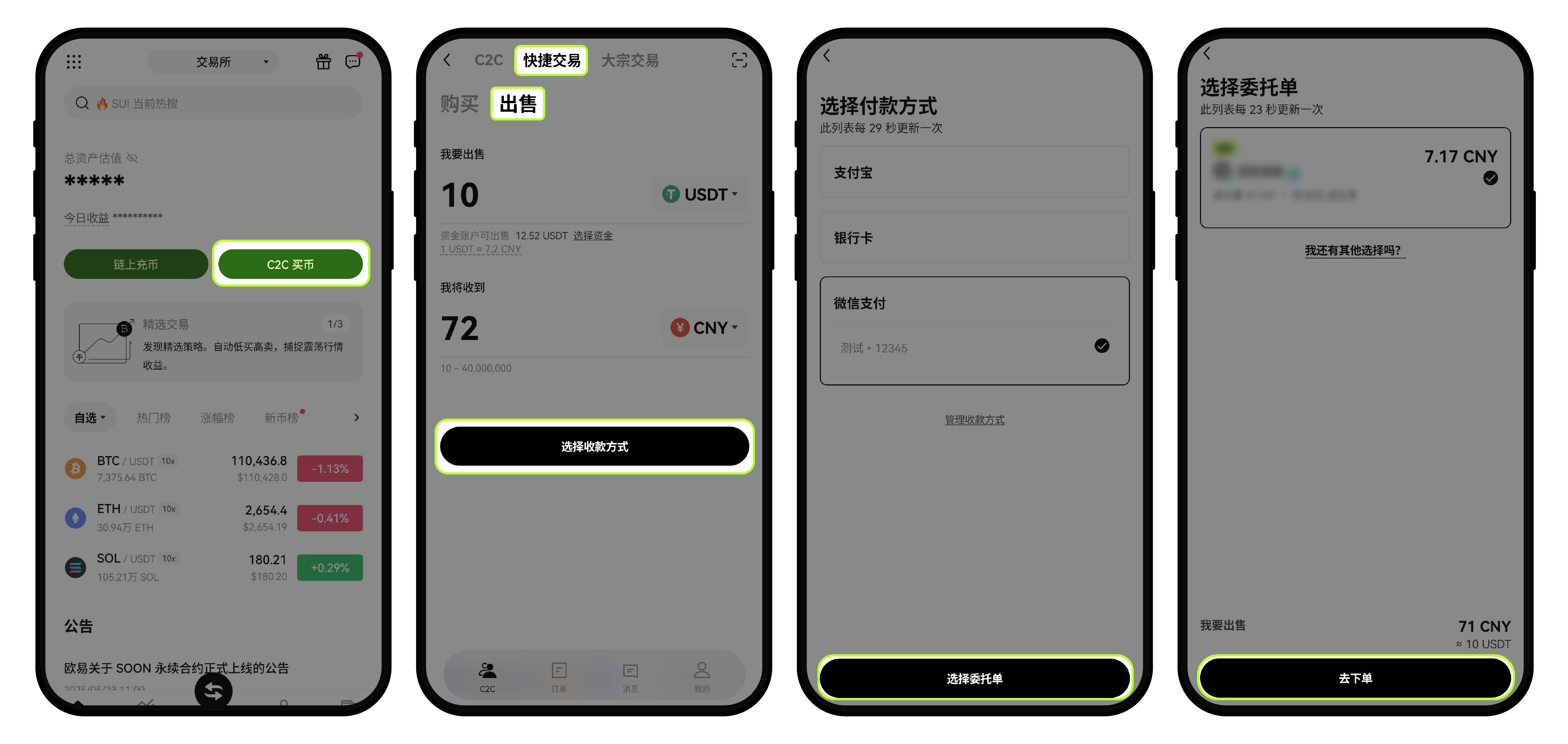 打开 App,点击【C2C 买币】-【快捷交易】- 【出售】,选择需要出售的数字资产;