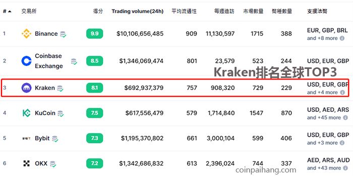 透过CoinMarketCap的数据,可查看到Kraken交易所被排到全球第三位(综合评价),24小时现货交易量约为6.9亿万美元,交易所评分8.5,评价较高。