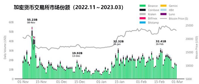 加密市场数据提供商CryptoCompare的报告显示,Kraken在成交量的市场份额排在Coinbase之后,估计在5%左右。而加密货币交易市场上的主导者仍然是币安(Binance),在FTX崩溃后其占据了全球50%以上的市场。