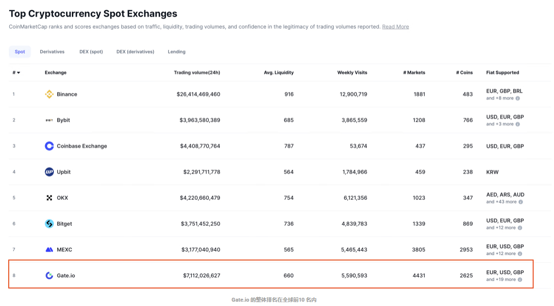 从Coinmarketcap 的数据来看(2025/4),Gate.io 的整体排名在全球前10 名内,单从交易量来看排名第二(仅输给安币)。