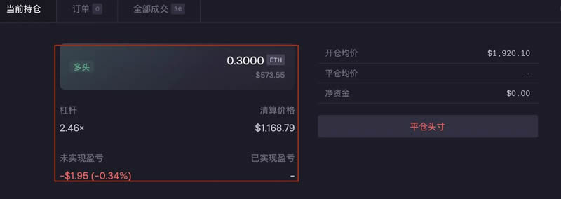 第五步:成功开仓后可以在「当前持仓」追踪仓位盈亏与清算价格