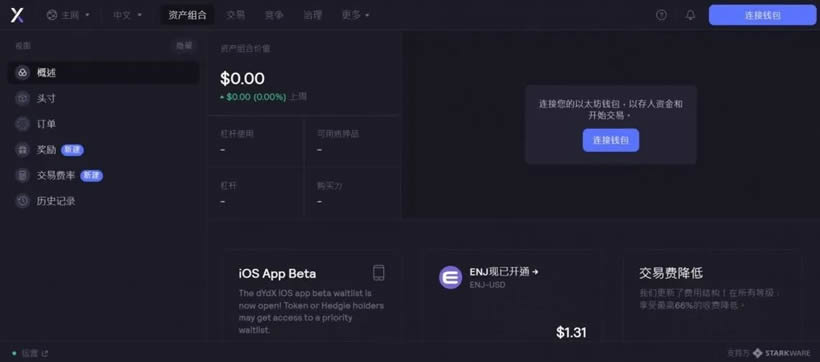 第一步:点击右侧连结钱包,并在平台上存入款项后(dYdX 类似于中心化平台的机制,需要先存钱进去)