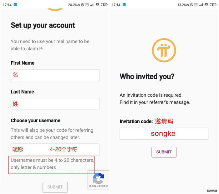 2.依次输入名、姓、昵称,点击SUBMIT。(名和姓可以输入中文,昵称4-20个字符),填入邀请码,点击SUBMIT。(可免费获取一个pi币,3天后邀请你加入安全圈,挖矿速度翻倍)