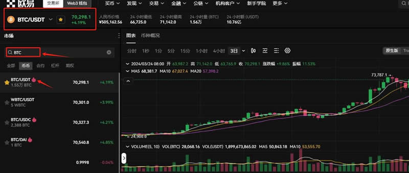 9、在搜索框输入BTC,选择BTC/USDT交易对,可以看到BTC实时行情,就可以进行BTC交易了