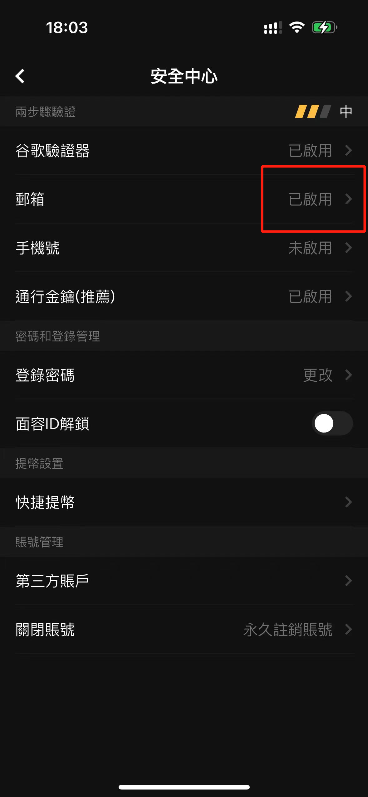 在已启用的验证方式(如邮箱、谷歌验证器、通行密钥等)右侧会显示“已启用”状态,点击进入后可看到“更改”选项。