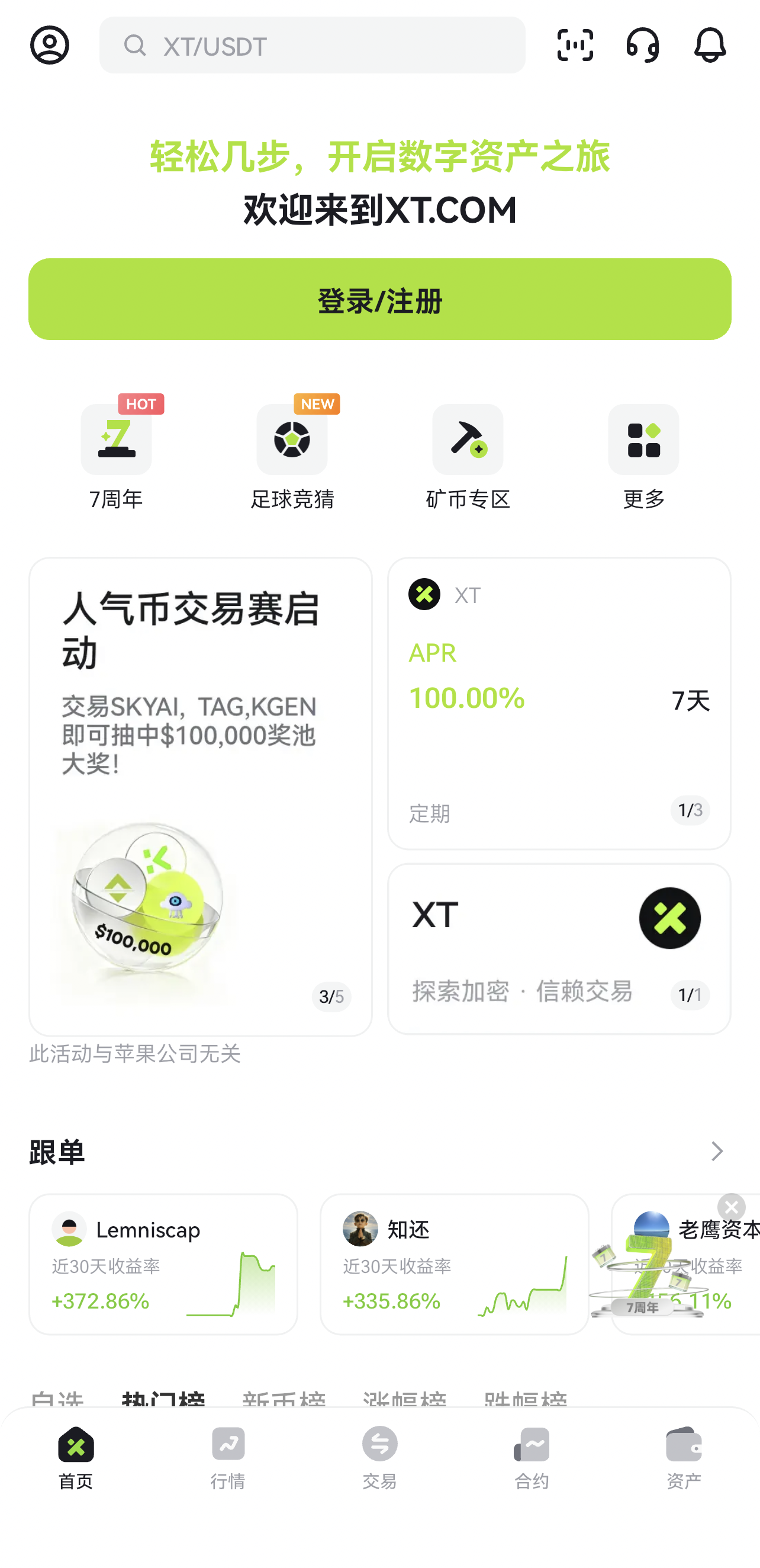 打开XT App,进入XT首页,点击【登陆/注册】按钮。