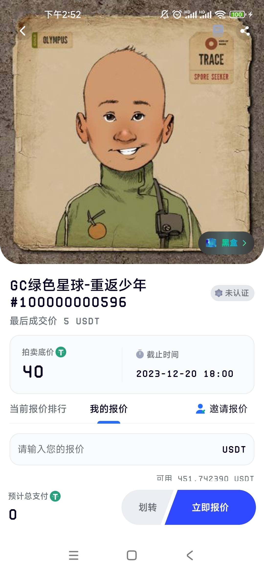 ②拍卖:选择市场带有标签“拍卖”的NFT,输入报价后点击立即报价,输入资金密码完成报价,在拍卖截止时间前,没有比你更高的出价才能获得NFT;
