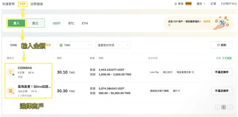 进入P2P 页面,选择「买入」,接着输入欲购买金额,系统就会筛选满足条件的卖家给你。