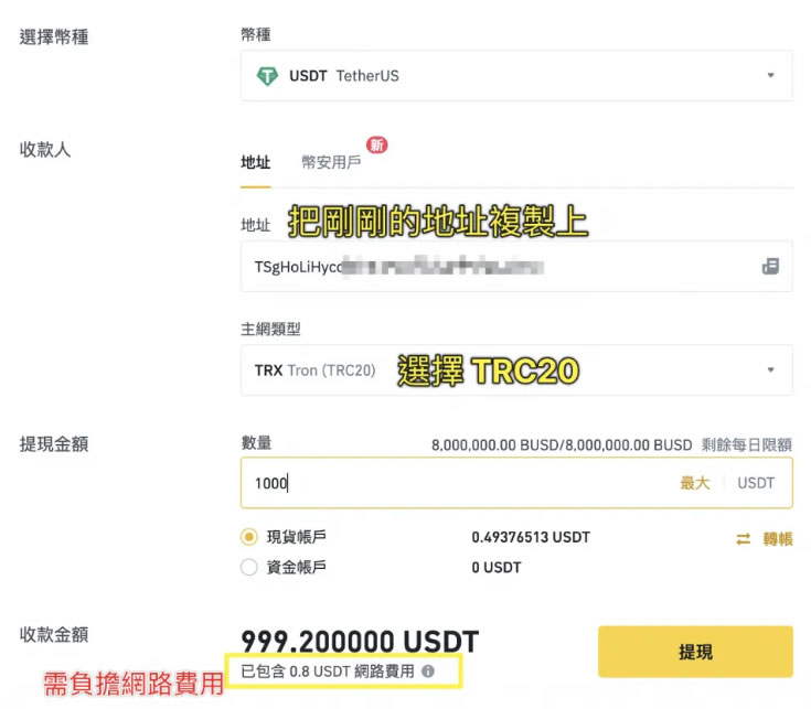 接着贴上你要转帐的地址,选择TRC20(两边区块网路一定要一样),输入金额后按下提交即可。