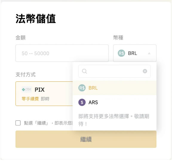 法币储值目前只支持BRL、ARS 等货币,还不支持台币。