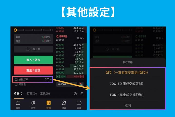 | GTC | 取消前一直有效 | 订单除非已经全部成交或是手动取消,否则会一直存在 |