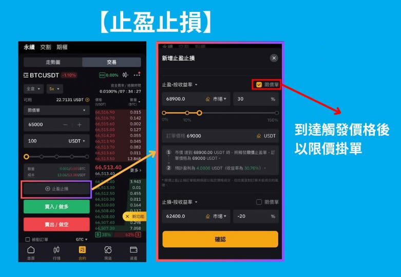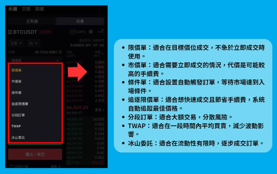 | 限价单 | 依照特定价格或更好的价格挂单,要注意,限价单不保证一定成交。 以买入为例,限价的目标价设定为$61,000 市价在$61,000以上:不会成交 市价落在$61,000 :以$61,000 限价成交。 市价低于$61,000 :以市价成交。 |