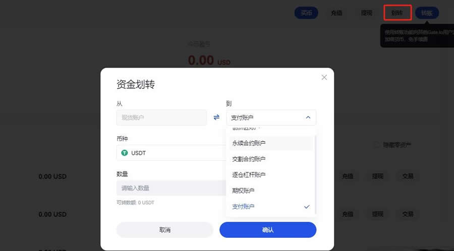 7、认证结束后,返回首页页面。出售USDT前需要将USDT划转至资金账户才可进行交易,选择首页的“资产”——“资金管理”——“划转”。在弹窗中选择币种USDT输入数量,点击确认即可(注意划转方向为现货账户到资金账户)