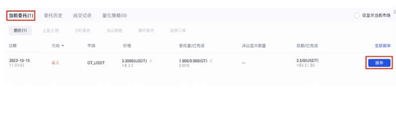 10、下单成功后,在交易页面下方的“当前委托”中可查看挂单情况,也可以点击当前订单后面的“撤单”撤销该笔订单。
