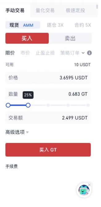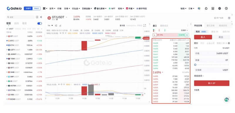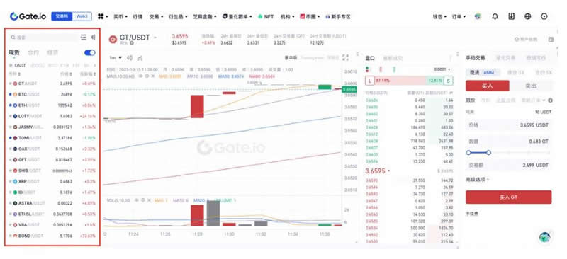 5、进入“现货交易”页面后,可以在左侧市场选择交易对进行交易(以GT_USDT为例)。