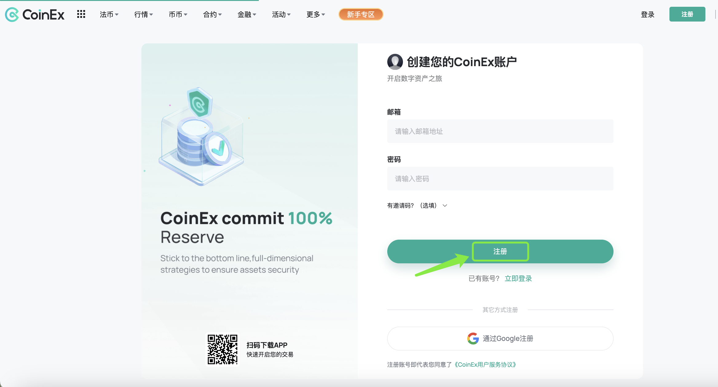 1、通过浏览器访问CoinEx官网,点击右上角【注册】。